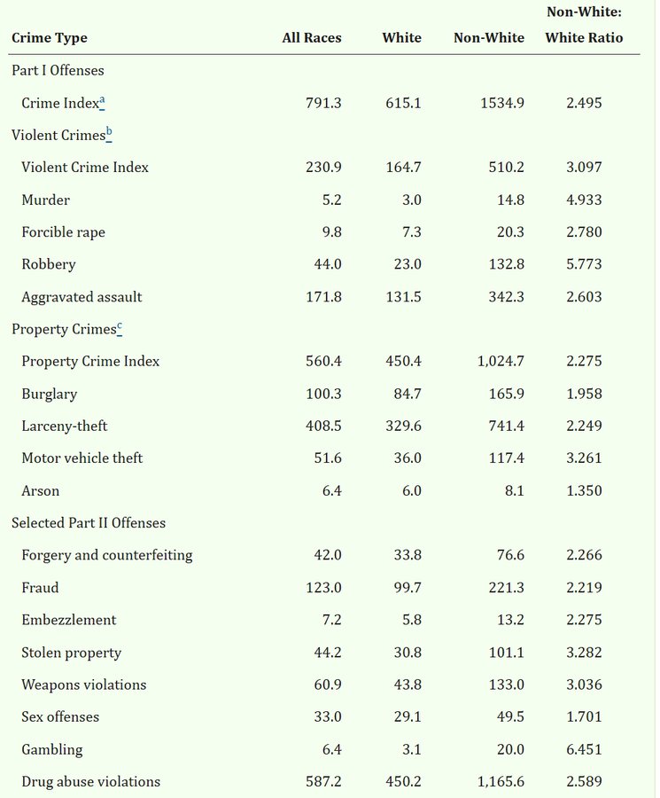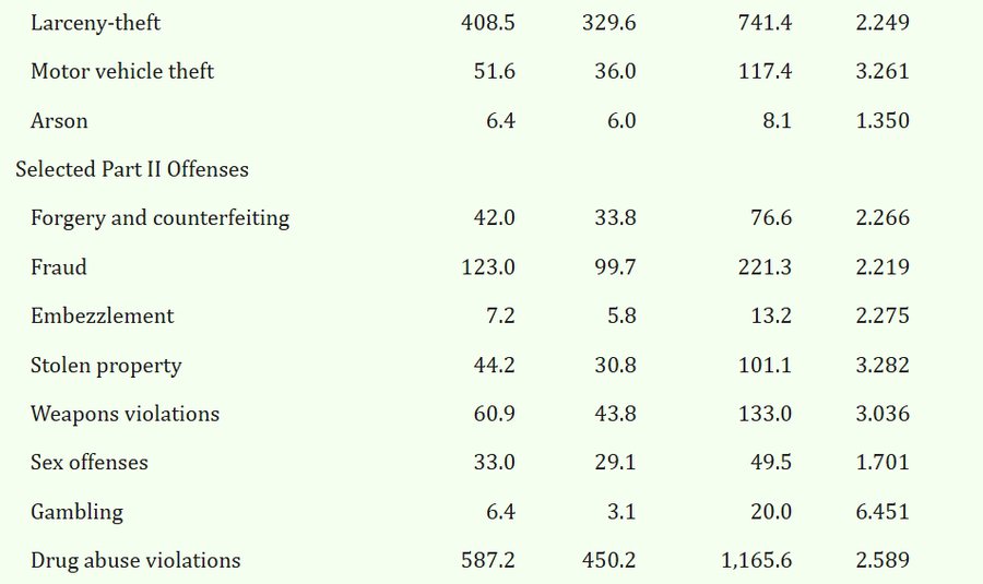 One of the key disputes in the race–crime literature concerns the overrepresentation of Blacks in official crime statistics. As shown in Table 1, non-White arrest rates are higher than White arrest rates for all crimes (and summary indices).1 For example, the non-White arrest rate for robbery was 132.8 per 100,000, whereas the comparable rate for Whites was 23.0 per 100,000. The non-White to White robbery ratio was 5.773, indicating that for every one White who was arrested for robbery, almost six non-Whites were arrested for robbery. -